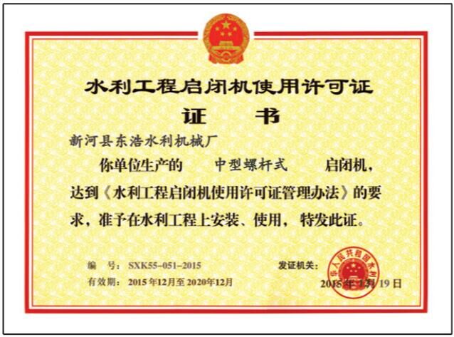 中型螺杆式启闭机许可证